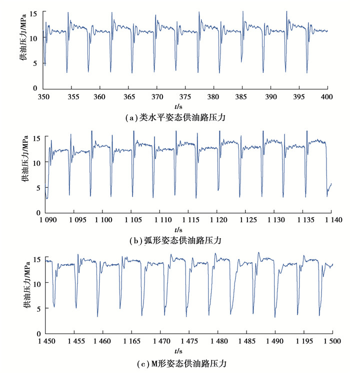 根据随车智能监测平台记录的结果,混凝土泵空载时的供油路压力P′p为3.4 MPa,3种姿态稳定浇筑时段泵送油Pp如图 16所示。可以看出,混凝土推送周期T=3.8 s,每个周期的压力波形近似于梯形波。