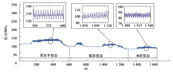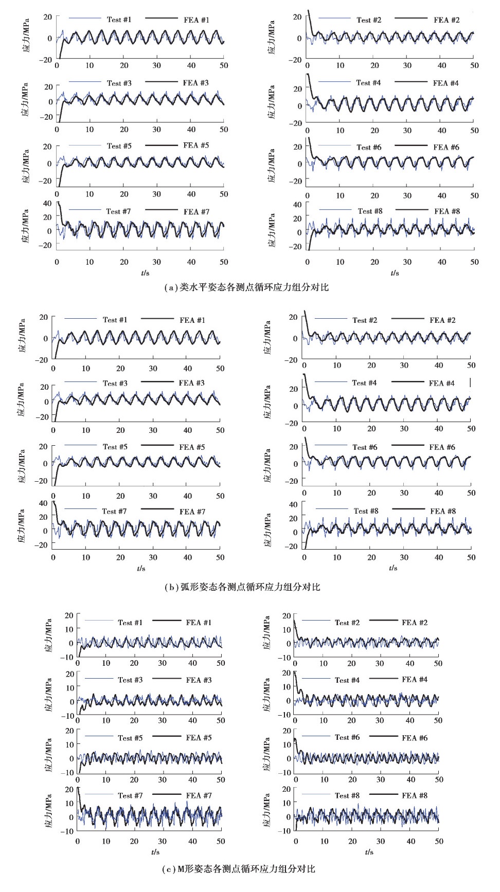 b.循环应力组分对比。对于混凝土泵车3种姿态浇筑时的循环波动组分的对比,将循环波动的平衡点置零进行直观比较。3种姿态下,各测点应力响应的循环应力组分曲线如图 20所示。仿真与测试得到的应力循环组分变化趋势及幅度基本相同,且仿真的循环应力组分较测试应力的循环应力组分相比,更为光滑。另外,从3种姿态的仿真与测试结果还可以看出:类水平姿态和弧形姿态的位移振幅与应力的仿真结果与M形姿态相比更接近实验测试结果。