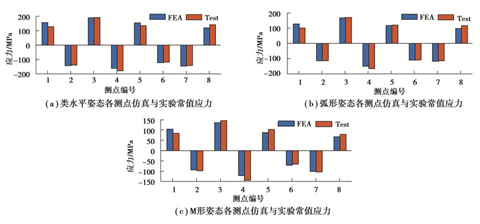 a.常值应力组分对比。将3种姿态的仿真应力与测试应力的常值进行提取与统计,绘制的柱状对比图如图 19所示,一方面,仿真应力与实验测试应力的常值组分基本吻合;另一方面,测试应力与仿真应力差值较大的测点在3种姿态下相差的趋势相同,尤其以#1测点、#4测点和#8测点最为明显,其最大相差值接近实验测试应力的25%。