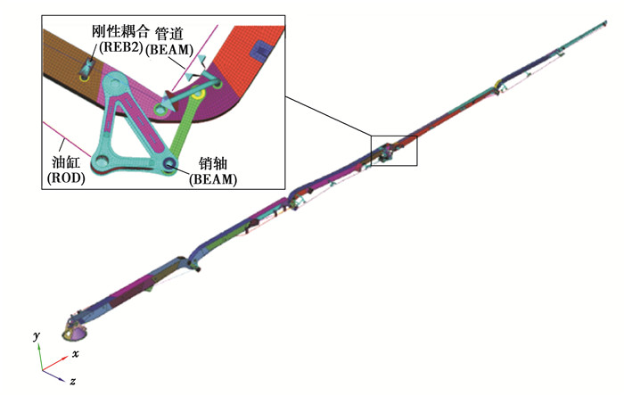 2) 臂架系统。臂架单元类型选择与底架相似,综合采用杆、梁、壳及实体单元类型对臂架各构件进行模拟,其中支撑液压缸采用杆单元建模,销轴和混凝土管采用梁单元建模,销孔壁采用梁单元模拟,销轴与孔的作用关系采用REB2刚性蛛网进行连接模拟,并释放梁单元节点处的轴向旋转自由度以保证用于模拟销轴的梁单元具有与实际相符的运动自由度,不考虑销轴与孔的配合间隙。各焊接钢板采用壳单元建模,转台底部厚板采用实体单元建模,臂架系统有限元模型如图 3所示。