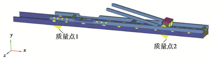 混凝土泵车作业时,混凝土泵受到的泵送反力冲击通过混凝土泵与副车架的连接结构传递到副车架上,因此,需对底盘副车架和大梁进行详细有限元建模以确保泵送反力对下车的冲击传载尽可能准确。汽车底盘视作被底架抬离地面的质量体,可采用附加于底盘大梁上的附加质量模拟该质量体以进行简化。进行有限元前处理时,应根据混凝土泵车实际的前、后轴载荷计算出底盘大梁前、后轴位置的附加质量点单元的质量大小,并通过刚性耦合将其固定在底盘前轴与后轴的相应位置,有限元模型如图 4所示。