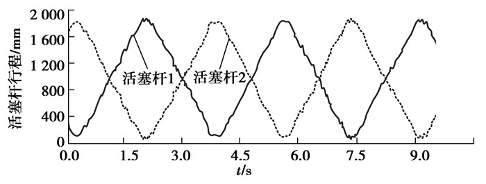 文献[17]提供了混凝土泵两个活塞杆推送混凝土时的应变电压信号变化曲线,如图 8所示。在每个推送周期内,活塞杆的负载变化趋势与本文中提出的混凝土流速变化一致,证明了采用式(6)计算混凝土摩擦阻力的合理性。