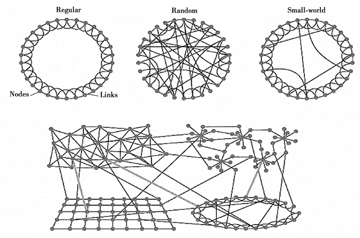 复杂网络,是呈现高度复杂性的网络,严格定义是指具有自组织、自相似、吸引子、小世界、无标度中部分或全部性质的网络,常被应用于研究现实世界中各种复杂系统的模型建立。目前复杂网络的研究内容包括以下几个方向:几何性质、形成机制、网络演化、结构稳定性、网络动力学机制以及多重复杂性融合等问题[6]。