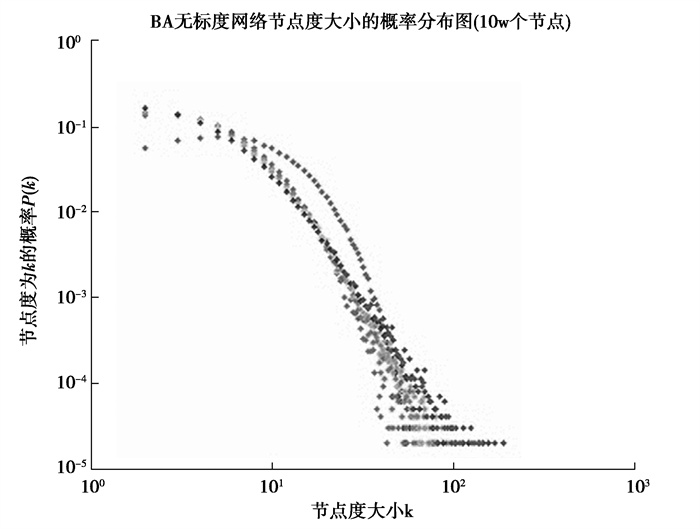 3) 无标度:无标度网络是指分布严重不均匀,较少的节点具有较高的介数,而其余大部分节点介数较低,度分布符合幂律分布,即P(k)~k-γ的网络称为无标度网络(如图 5所示)。