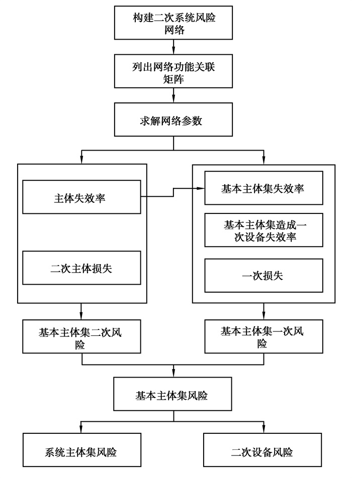 该方法是结合复杂网络理论和风险传递理论,鉴于二次系统中设备和功能的连接关系,定义网络风险元素,并考虑网络元素间的相互影响,构建二次系统风险传递网络并建立了一套评估二次系统风险的指标体系。具体流程如图 8所示:通过建立待评估二次设备的风险网络,构建网络功能关联矩阵,求出节点度、主体度等相关网络参数,对基本主体集失效概率和损失进行分析,得到基本主体集风险,最后根据基本主体集风险求出系统级和设备级的其他风险指标[15]。