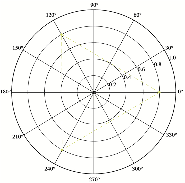采用Hand DJ[19]提出的一种具有可视化优点的度量指标方法AUCarea。AUCarea会将所有的AUC的值在极坐标上绘制出来。如图 1所示,黄色虚线三角形代表的就一个是三分类的AUCarea极坐标图示,黄色虚线所覆盖的面积就是最终度量值。AUCarea的计算公式如下