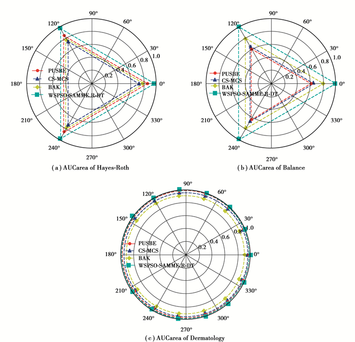 为了更直观的对比4种算法的分类效果,图 3给出了4种算法AUCarea值的部分polar图。根据图 3所示,图中红色虚线代表PUSBE;蓝色虚线代表CS-MCS;黄色虚线代表BAK;青色虚线代表WSPSO-SAMME.R-DT。他们所围成的面积就是其对应的AUCarea的值。从图中可以看出WSPSO-SAMME.R-DT在Hayes-Roth与Balance数据集中面积最大,意味着在这两种数据集下,WSPSO-SAMME.R-DT优于其他3种算法,在Dermatology算法中排名第二,但是与该数据集下的最优算法PUSBE所产生的面积相差不多。