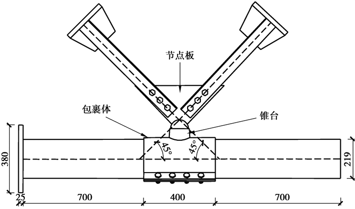 1 试验概况 1.1 试件模型设计以内蒙古白云鄂博地区某1.5 MW锥台型风电塔筒为原型基础,设计四肢柱格构式钢管混凝土风电塔架,设计塔架共16层,高62.4 m,塔架顶部直径2.7 m,底部直径4 m,相邻腹杆之间的角度按照《钢结构设计规范》中的要求设定。综合考虑风电机组自重、风轮叶片风荷载、塔架自重、塔架风荷载等有关因素,通过SAP2000分析在考虑暴风工况下塔架的内力分布规律。由于试验场地及加载设备限制,选取塔架压、拉腹杆荷载比例为1∶1.12的塔架上部一节点进行加载,并依此设计4个1∶1.6插板式节点缩尺试件。设计时主要考虑的参数为节点板厚度和球柱高度,节点各部件委托加工厂制作,于实验室进行组装,节点模型构造满足《钢结构设计规范》和《高耸结构设计规范》的相关规定。试件塔柱采用20号热轧无缝钢管。锥台壁厚8 mm,锥台与外包裹体焊接连接。球柱开槽,节点板插入槽中,通过焊接连接。角钢与节点板、上下侧包裹体均采用M20的10.9级高强螺栓连接。试件几何参数见表 1,节点示意图见图 1。各试件除节点板厚度和球柱高度不同外,其余部件的几何构造、制作工艺及装配方式均相同。