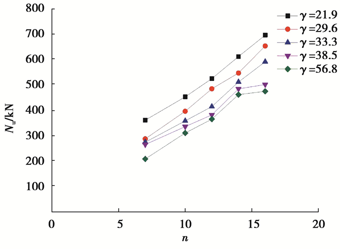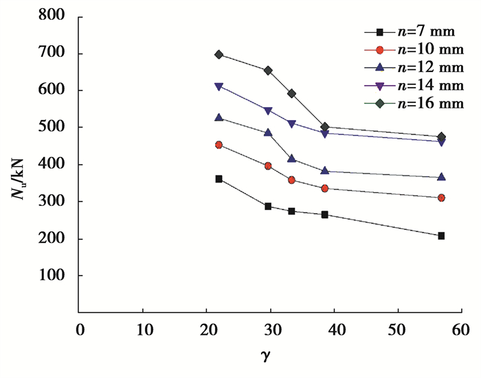 由图 9可知,试件的极限承载力总体随γ增加而减小。当γ由21.9依次增大至56.8时,图 9中不同节点板厚度n的不同区间曲线斜率依次在-5.2~-9.6,-9.5~-18.9,-4.3~-6.3,-0.9~-1.44之间;当γ≤38.5时,试件的极限承载力随着γ的增大的下降的幅度较大;当γ>38.5时,试件的极限承载力随着γ的增大的下降幅度较小。在风力发电塔架中,柱肢需要承担较大的轴力,笔者提出的万向球板节点高应力区主要集中在包裹体上,为保证其具有较高的强度储备且充分利用材料,建议包裹体径厚比γ取值应在38.5左右。