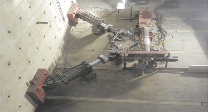 本试验采用卧位加载方式,将此类节点模型卧放置于试验台座上,塔柱两端分别通过地脚螺栓固定于反力制作与试验台座上。两斜腹杆分别为受拉腹杆与受压腹杆,并通过其端部的加载板与液压伺服器相连。试验加载装置图如图 2所示。