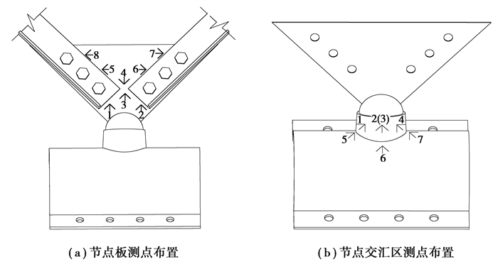 1.3 测点布置万向球板节点试件上节点板区域与节点交汇区受力较为复杂,测点布置如图 3所示。