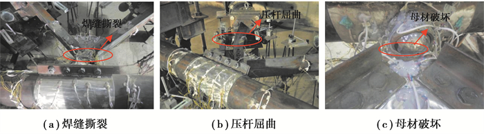 试件JD4:当拉力达到约156kN时,受压腹杆发生弯曲。当受拉腹杆拉力达到约175 kN时,钢球与节点板连接的焊缝被撕坏,随后钢球母材被撕坏,试件破坏试验结束。试件JD4为球体强度破坏。试件最终破坏模式如图 4所示。