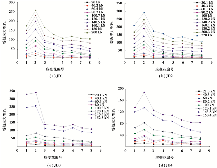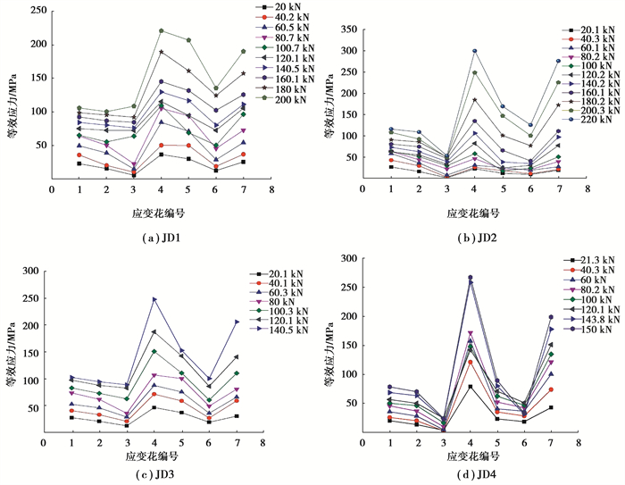 图 6表示各试件节点交汇区等效应力分布曲线。由图 6可知,在加载初期,节点交汇区各测点等效应力分布较为均匀,随着荷载的不断增加,等效应力的分布出现较大差异,且试件JD1~JD4的节点交汇区等效应力峰值点均位于4号测点位置, 即锥台上靠近受拉腹杆方向部位处。在实验过程中由于JD1与JD3的球体转动的原因导致3号应变花处等效应力80.7 kN~100.7 kN期间的增幅相比JD2, JD4的大。其中试件JD1等效应力最大值约为220 MPa;试件JD2的等效应力最大值约为300 MPa;试件JD3的等效应力最大值约为250 MPa;试件JD4的等效应力最大值约为260 MPa。对比包裹体径厚比均为29.4的试件JD1、JD2在同一级荷载作用下等效应力分布情况知:试件JD2较试件JD1的等效应力分布情况更为均匀,表明节点板越厚其等效应力分布越均匀,这是因为节点板越厚越能更好地缓解节点交汇区的应力集中现象。对比包裹体径厚比分别为29.4与23.9的试件JD1、JD3在同一级荷载作用下等效应力分布情况知:在同一级荷载作用下,试件JD1包裹体上测点(测点5、6、7)的等效应力值明显小于试件JD3包裹体上对应的测点的等效应力值,即包裹体的径厚比越大,等效应力值越小。建议在保证节点受力的前提下,尽量选用径厚比较大的包裹体,以免材料被不完全利用,造成浪费。