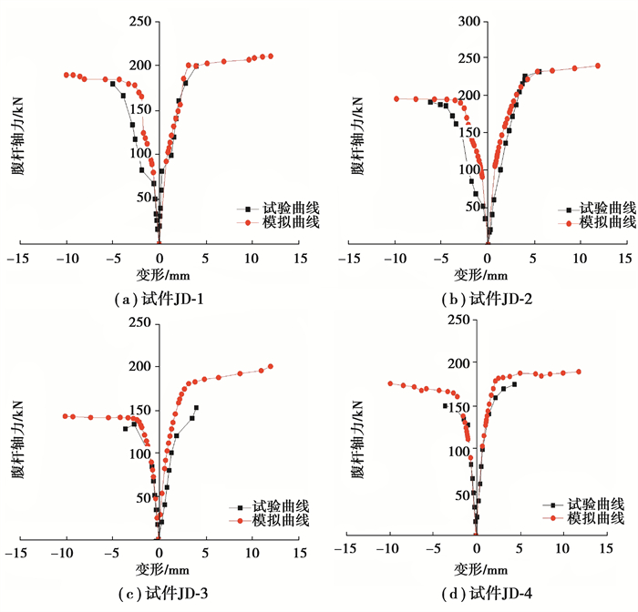 试件JD2:当受拉腹杆拉力达到约127 kN时,受拉腹杆和受压腹杆发生轻微弯曲。当受拉腹杆拉力达到约231 kN时,受压腹杆发生屈曲破坏,试件破坏试验结束,试件JD2为受压腹杆屈曲破坏。