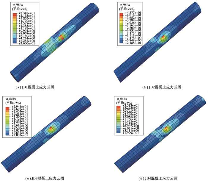 在钢管混凝土结构中,核心混凝土限制了钢管壁的变形,大大提升结构的整体承载能力,而由于实际试验条件的限制,未在试验中得到其核心混凝土上的应力值大小与分布情况。借助ABAQUS有限元对万向球板节点的核心混凝土部分的应力分布情况进行分析。图 8为各个试件的核心区混凝土等效应力分布图。由图 8可以看出此万向节点高应力区主要集中在核心混凝土中部区域即包裹体所在位置,此部位混凝土主要起局部承压作用,其他部位混凝土受力较小。试件JD-1等效应力峰值为23 MPa,试件JD-2等效应力峰值为43 MPa,试件JD-3等效应力峰值为29 MPa,试件JD-4等效应力峰值为35 MPa。总体而言,除应力集中点,绝大部分承压混凝土实际受力处于10 MPa~25 MPa之间,混凝土强度未得到有效利用。