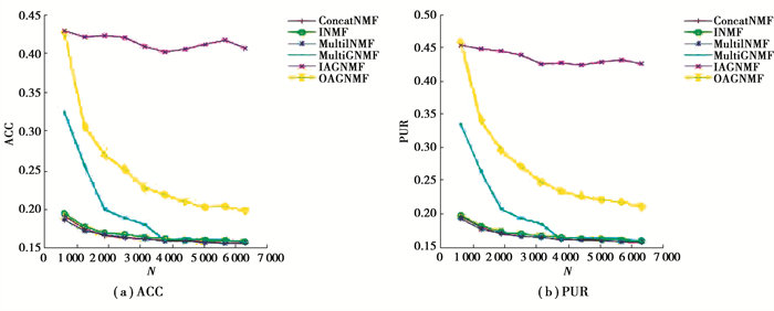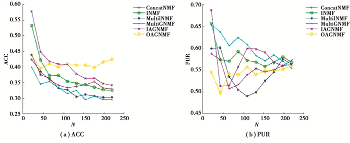 3.3 实验设置实验当中,比较算法ConcatNMF、INMF、MultiINMF和MultiGNMF的参数选择与其原始文献中相同。文中提出的IAGNMF图正则化参数λ=15,权重分散程度参数γ=1.3;OAGNMF图正则化参数λ=15,权重分散程度参数γ=1.3,缓冲区大小设置为40%数据集大小。每次实验非重复地取1/10数据集的实例作为新到来的实例运行算法学习其低维共享特征,运行10次之后完成对整个数据集的特征学习。对于增量算法,每次学习新实例的低维共享特征后,记录学习时间,与已经完成特征学习的实例的低维共享特征一起进行聚类分析验证学习效果;对于非增量算法,新实例和已完成特征学习的实例一起进行特征学习,记录学习时间,将学习到的所有实例的低维共享特征进行聚类分析验证学习效果。对于每次模型运行,都能得到其时间开销,聚类精度和纯度。每个实验重复运行15次,并取其均值输出比较结果。