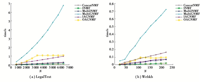 图 4给出了几种比较算法的时间性能。从图中可以看出,基于图规则化的MultiGNMF比ConcatNMF、INMF和MultiINMF需要消耗更多的时间。IAGNMF和OAGNMF同样使用图规则化提升算法的性能,但其增量实现能够有效减少算法的时间开销。