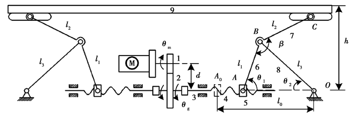 1 结构设计及参数初步匹配 1.1 举升系统结构设计换电机器人举升系统如图 1所示,由交流伺服电机、减速齿轮、丝杠螺母机构、摇杆滑块机构及电池托盘组成。举升过程如下,交流伺服电机通过1对齿轮(1,2)和联轴器3带动丝杠4旋转,进而驱动滑块5沿导轨作直线运动,滑块带动连杆(6,7,8)作平面运动,连杆7末端限制在电池托盘9的水平槽孔内,连杆7末端的竖直分运动完成电池托盘的举升。图 1以A0为原点,A0-O为x轴正方向,垂直于A0-O向上为y轴正方向建立坐标系。