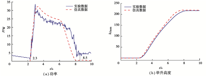 4.2 样机实验为验证优化结果的可靠性,根据集成优化的参数加工1台换电机器人,搭建实验平台,实验现场如图 10所示。实验中将80 kg的电动汽车动力锂电池包举升220 mm,测量举升过程的能耗和稳态误差。其中,功率信号采用HIOKI公司生产的日置功率测量仪进行采集,对时间积分得到换电机器人举升过程的能耗;另外,通过举升伺服电机的编码器测量得到举升过程的实际角位移,与期望角位移作差获得稳态误差。将实验测得的能耗和角位移稳态误差与仿真数据进行对比,结果如图 11和表 5所示。