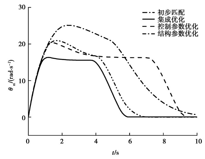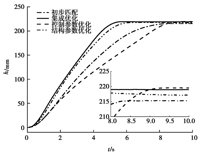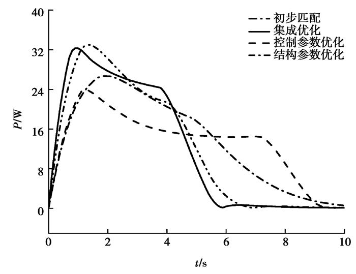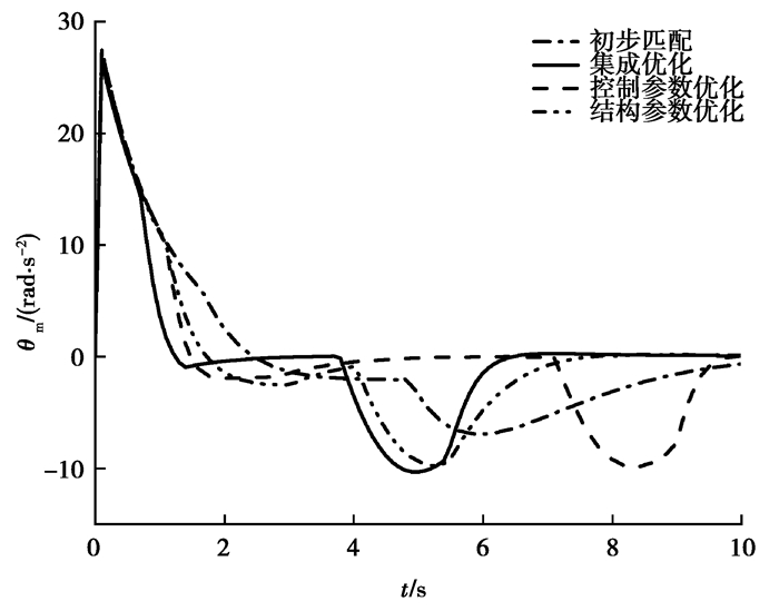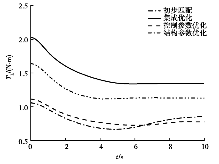 由图 4可知,结构和控制参数集成优化后的功率曲线上升更快,收敛最快。这是因为结构参数和控制参数会影响举升系统的期望角位移和负载力矩。由图 5~图 7和表 4可知,虽然集成优化后的负载力矩大于单独优化的负载力矩,但是集成优化后角速度和角加速度小于单独优化,且收敛最快,所以集成优化后的功率曲线上升更快,收敛最快,能耗最低。