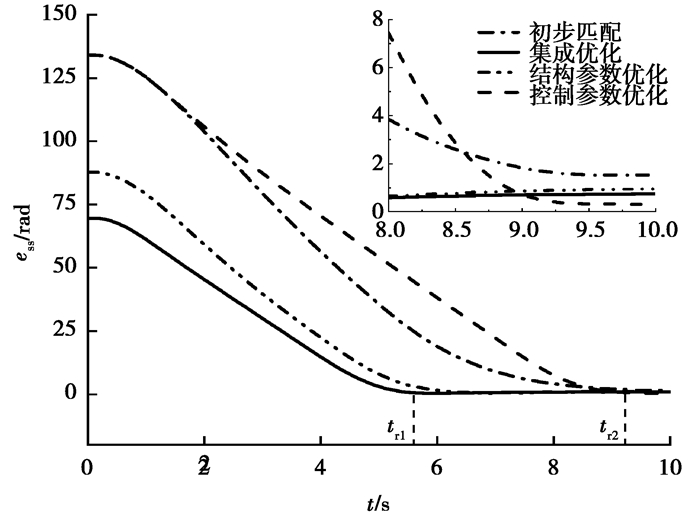 由图 8和图 9可知,结构和控制参数集成优化后的角位移稳态误差小于优化前,响应速度最快;单独优化控制参数的稳态误差最小。这是由于举升系统等效转动惯量与结构参数中的传动比i和连杆长度l1,l2,l3有关,系统等效转动惯量增大会导致换电机器人在举升电池时惯性增大产生颤动,在优化结构参数时会改变举升系统等效转动惯量,优化系统的稳态误差;而优化控制参数能够直接影响举升系统精度,对举升系统的稳态误差影响最大。