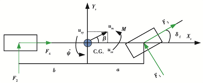 | $ m u_{s x}(\dot{\beta}+\dot{\psi})=F_1 \cos \delta_{\mathrm{f}}+F_2+F_3 \sin \delta_{\mathrm{f}}, $ | (2) |