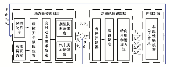 通过上层轨迹实时规划和下层实时跟踪此刻轨迹,并根据障碍物汽车和智能汽车状态实时动态变化,整个避障过程实时调整轨迹,从而实现智能汽车实际交通环境的安全动态侧向避障控制,具体控制策略控制框如图 2所示。采用转向与附加力矩相结合的方式,有利于提高动态侧向避障过程的车辆稳定性。