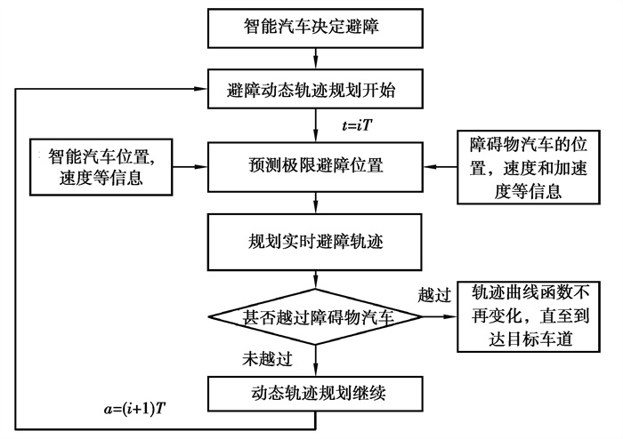 避障轨迹动态规划流程图如图 3所示。当智能汽车决定避障,即开始启动动态避障轨迹规划。首先,根据自车位置,速度等信息,结合障碍物汽车的位置,速度和加速度等信息,基于极限位置假设,预测极限避障位置;其次,根据预测避障位置,规划实时避障轨迹。同时,如果智能汽车侧向位移已经超过障碍物汽车的最外点,智能汽车将不会与障碍物汽车发生避障,实际上智能汽车已经完成了避障。因此,需要判断智能汽车是否越过障碍物汽车,如果越过了,避障轨迹形状将不发生变化,并利用此形状不变的轨迹,控制智能汽车变道到目标车道;如果没有越过,动态轨迹规划继续,根据障碍物汽车状态变化,实时调整避障轨迹形状。