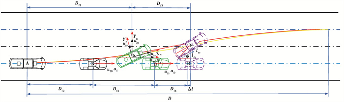 图 4显示了智能汽车侧向避障动态轨迹过程,车辆A为智能汽车,车辆B为障碍物汽车。假设智能车辆行驶在平直道路上,不考虑道路的弯道和坡度。黑实线车辆、绿实线车辆和紫虚线车辆分别为决定开始避障的初始位置、实时位置以及实时位置预测的车辆避障极限位置。红线为实时位置前一时刻规划的避障轨迹,智能汽车以此参考轨迹由实时位置前一时刻运行到实时位置;黄线为实时位置动态规划的实时时刻运行到下一时刻的侧向避障实时参考轨迹。以实时位置为例,介绍智能汽车侧向避障动态轨迹规划。基于实时的障碍物汽车车速和加速度以及智能车辆车速和航向角等状态,在每一个采样时刻,假设预测时间内,智能汽车大地坐标系下的纵向车速和航向角不变,进而预测智能汽车和障碍物汽车形成极限避障位置,如图 4所示。