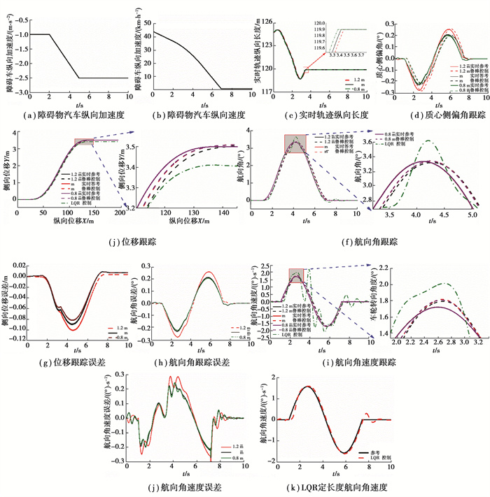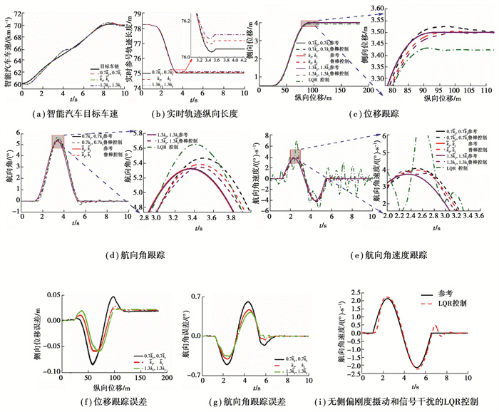 综上所述,所提控制策略实现了前后侧偏刚度参数摄动和航向角速度信号干扰的动态参考轨迹跟踪鲁棒控制,克服了智能汽车车速动态变化,获得了良好智能汽车动态侧向避障控制,保证了侧向动态避障汽车横摆稳定性;并且,跟踪效果优于LQR控制效果。