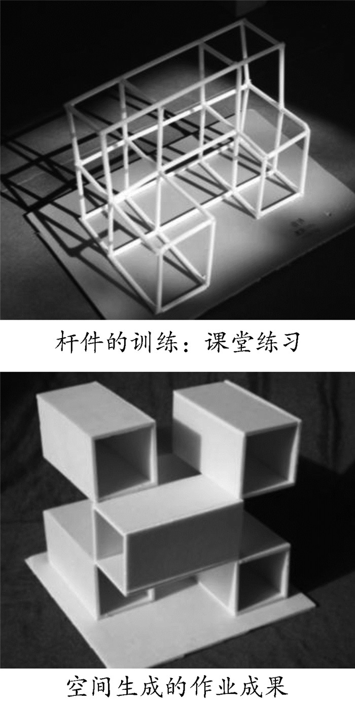 建筑设计基础课程群中建筑设计基础是核心课程,建筑美术和建筑学概论除完成自身课程的基本知识点外,主要配合建筑设计基础课的专题训练提供相应的理论、技能等支持。课程专题训练的融贯主要体现在建筑设计基础课的专题内容不仅安排在设计基础课上,也安排在建筑美术和建筑学概论上讲授,引导学生多层面地了解该专题的知识点、多视角地训练专题的教学内容,自主地构建课程群课程之间知识点的关联和逻辑。例如:建筑设计基础Ⅰ的第一个专题是空间生成训练,在秋季授课安排中,建筑学概论(16课时)先开课,其中一讲是关于空间的基本知识点,然后是建筑美术Ⅰ(48学时),最后一个专题是为随后的设计基础课过渡。它基本依照建筑空间生成的三种基本方法:杆件、板片和盒子,将这三种方式以立体构成的方式去训练,形成一种非建筑空间的造型训练(图 1)。到建筑设计基础上课时,首先是空间生成训练,因课程训练的侧重点不一样,此时的空间生成要比建筑美术课的有更多建筑化倾向。由于此前学生已经过美术课的训练,大部分学生在设计基础课上完成的空间作品表现出的造型能力、空间认知和图面表达都较以往未实施融贯教学有明显提高(图 2)。春季学期中建筑设计基础Ⅱ的课程训练都是创作型设计课题,延续上学期知识点融贯的穿插授课方式,建筑美术Ⅱ主要在表现技能训练方面与设计基础课交叉。