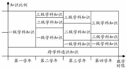 基础课的内容通常与一级学科对应,专业基础课的内容通常与二级学科对应,专业课的内容通常与三级学科对应,由此,图 2的解释可改为:在四年学制的课程教学周期中,第一学年集中教学一级学科知识,课程比例100%,第四学年集中教学三级学科知识,课程比例接近100%,同时有必要的一级学科知识和二级学科知识延伸;从第一学年到第四学年综合来看,一级学科递减,三级学科递增,跨学科通识知识的教学则贯通整个周期,如图 3所示。