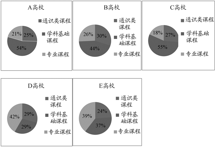 由图 1可知,五校各类课程占比略有差异,通识课程占比的差异较小,主要与各校通识类课程开设的学时数差异有关。其中D高校通识类课程特色显著,设置了“第二课堂” ①,并且学生至少要选择4个“第二课堂”才能满足毕业基本条件。学科基础课程和专业课程的差异与各高校将相同课程划分到不同的课程类别有关。如建筑设计课程,C高校将其列入专业核心课,配合安排原理类课程和技术类课程,而其他四所高校将其列为学科基础课程。D高校专业课程占比最高,学科基础课程占比最小;C高校恰好相反。究其原因,D高校开设了一系列专题研讨课、专题交流讲座等,这类讨论课的开设有效解决了缩减总学分背景下专业课程被迫缩水的问题,体现了教学方式的开放性变革与创新教育教学理念的新趋势;特别是将交流讨论课程与建筑设计课相结合,充分显示了创新思维、交流互动所独具的教学特色。C高校专业课程占比较低的原因是学时学分对应关系严格,可变动性小,在缩减总学分的要求下,通识类课程学分必须满足最低学分要求。