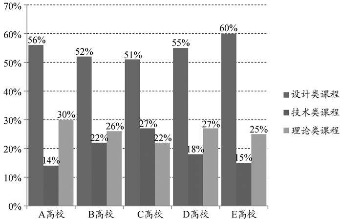 图 2 五校设计类、技术类、理论类课程学时占比统计表 |