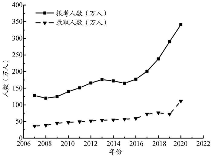 二、构建研究生导师团队机制的必要性 (一)研究生招生趋势的变化图 1-2为研招网及教育部统计的2007—2020年研究生考试分数及报录人数变化情况。由图可知,随着社会需求以及大学生择业态度的变化,一方面考研人数逐年上涨,2007年考研人数约为128.2万人,而2020年已达到341万人,13年间涨幅达到约1.7倍,尤其以2016年至2020年增长最为迅速,增量达到2007年招生总人数的0.4倍,考研已成为当下大学生的热门话题。与此相对,2020年本科生招生人数约为460万人,即每年有参加研究生考试意向的大学生已达本科招生人数的3/4。当然在庞大的研究生考试人群中也存在一些考生是盲目跟风,对研究生阶段的学习缺乏明确的目标与规划。