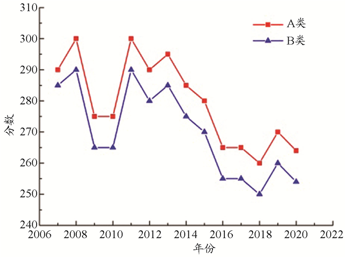 另一方面研究生招生规模也呈逐年扩大趋势,2007年研究生招生人数仅为36.4万人,2020年则增长至111.4万人,13年间研究生招生规模扩大约2倍。然而,研究生考试录取分数线随招生规模的增加逐年下降,2007年A类与B类录取分数线为290分与285分,而2020年A类与B类录取分数线则降为264与254分。说明研究生的扩招虽然响应了社会对高素质人才的需求,并在一定程度上满足了大量大学生提升自我价值的愿望,但是研究生招生质量却有一定下滑。如何保持高水平研究生的培养目标,满足社会对高素质人才的需求,是目前研究生教育普遍面临的问题之一。