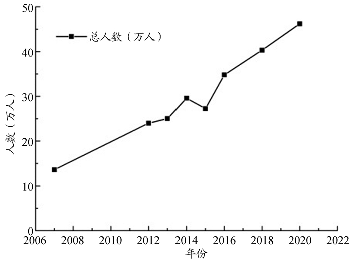 (二)导师规模与结构变化图 3为2007—2020年教育部公布的研究生导师数量变化情况,由于资料有限未取得2008—2011年变化数据,但目前数据依然可以宏观反映研究生导师的变化规律。由图 3可知,2007—2020年期间,研究生导师数量由13.6万人增长至46.2万人,涨幅达到2.4倍,略高于研究生13年间的涨幅,单从师资人数涨幅来看,导师队伍建设已不能满足研究生复合型人才培养的需求。