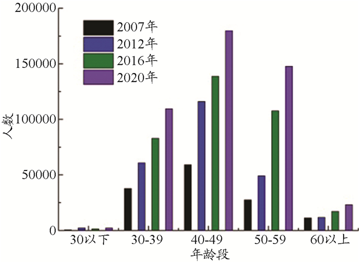 进一步对图 4所示2007年、2012年、2016年以及2020年研究生导师年龄构成变化进行分析。导师年龄构成基本为正态分布,年龄在40—49岁的导师占导师总人数的40%以上,这是研究生导师的主要构成部分。但是不同年龄段导师构成比例也存在一定变化,其中40—49岁与50—59岁年龄段涨幅最为显著,分别为2.04倍与4.37倍,40—49岁年龄段研究生导师涨幅与教师整体涨幅基本持平,但是50—59岁年龄段导师增长水平远高于整体水平。结合教学实践分析,此年龄段导师通常为业内资深教授,具有更为深厚的专业知识与丰富的实践经验,成为各高校研究生教育的中流砥柱,因此此类教师相较青年教师具有更多的研究生招生名额。师资力量分配在一定程度上的失衡现象,进一步加剧单一导师制下研究生的培养难度。