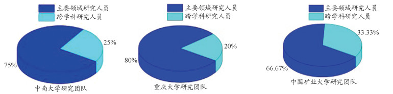以重庆大学土木工程学院研究团队、中南大学土木工程学院团队以及中国矿业大学力学与土木工程学院团队为例进行说明。重庆大学研究团队形成了以岩土工程防灾减灾与材料科学相结合的跨学科研究团队,将改良纤维混凝土有效应用于隧道灾害防治;中南大学研究团队将非饱和土的研究与交通工程相结合,对交通岩土的研究作出了重要贡献;中国矿业大学研究团队以采矿技术为基础,引入能源工程与环境工程等相关学科研究人员,组成了能源开采与环境保护的复合型研究团队。不同团队根据实际需要,对跨学科成员作出相应调整,从图 5中3个研究团队成员配置可以看出,导师团队中跨学科研究人员数量基本保持在1/4~1/3之间,这是因为适当的跨学科交流可以促进创新思维的产生,但如果一个团队的研究方向过于分散反而会对团队的研究产生消积的影响,因此应把握其中的分寸。