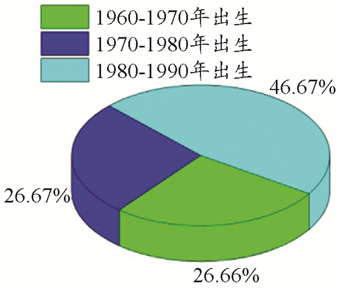 (三)导师团队人才梯队建设研究生导师团队人才梯队科学、合理的配备是综合型导师团队的一项重要指标。团队既要有常年从事该专业或领域教学科研工作的资深教授、专家,同时也要有一定数量的青年教师。资深教授、专家具有渊博的专业知识和丰富的实践经验,能够准确地把握团队的研究方向和发展进度,而青年教师虽然在专业知识和实践经验上不及资深教授、专家,但其学术思维可能更加灵活开阔,接受最新学术前沿的能力更强,可以为团队研究带来更多新方法、新观念,为团队注入活力,营造新的学术氛围。图 6为中南大学导师团队、重庆大学导师团队以及中国矿业大学导师团队成员年龄构成,可以看出,1980—1990年之间出生的成员接近团队总人数的一半,说明一个年轻化的导师团队是知识有效传承、研究有序推进的必要保障。