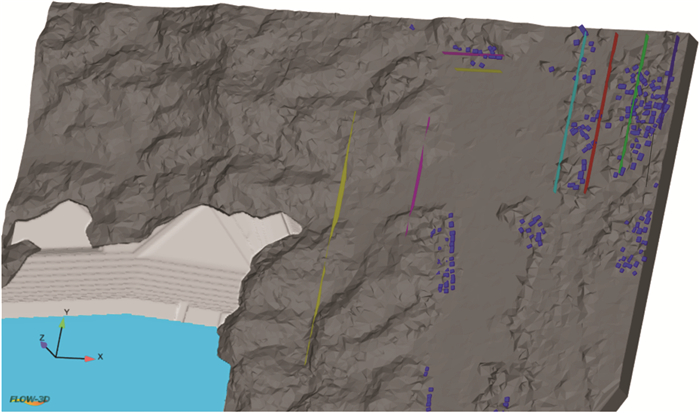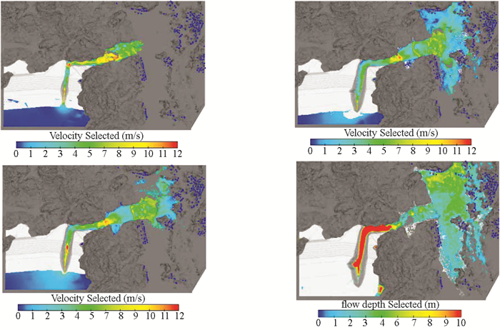 3. 实际效果模拟演示模块尾矿库溃坝后的大致过程如下:尾矿坝发生漫顶后,溃坝水流开始冲刷下游坝体,泥沙被不断的夹带和冲刷;坝体坡面下游形成初始冲槽,在水流的持续冲刷下,坝体表面的冲槽逐渐加深变宽;随着溃口流量的加大和流速的加快,冲槽逐渐向坝体上游推进,冲槽边坡出现失稳坍塌,坝体随之溃败[12-13]。在数值仿真基础上,运用3DS-Max、Flow-3D以及RealFlow等软件进行实例建模,并对溃坝砂流进行动态演示。以溃坝过程中坝体的破坏形态,溃坝砂流的流动特征及对下游的淹没区域为对象进行仿真再现。如图 3为发生漫顶溃坝时溃坝水流对坝体的侵蚀过程,在软件中输入相应的坝体物理参数及边界条件进行仿真可以直观地观察冲槽的形成和发展过程。学生只需要根据实际的工程背景,改变坝体尺寸、材料的参数及流体的相关性质,即可进行坝体溃败过程的模拟仿真。运用Arcgis等软件,导入之前无人机测绘得到的数据并进行三维建模,可以完整呈现库区周边的地理环境及库区的地形特征(如图 4所示)。在此基础上,软件可实现下泄尾砂量和尾砂覆盖面积的计算,为尾矿库溃决后灾害影响范围的精确测量和控制提供方便。同时,流体的流速、压力、深度、流量等信息也可以方便读取(如图 5所示)。相比传统的物理实验,虚拟仿真技术在条件设置、流量控制、结果读取、数据处理等方面为教学和科研提供了便利,也极大地激发了学生的学习和科研兴趣。