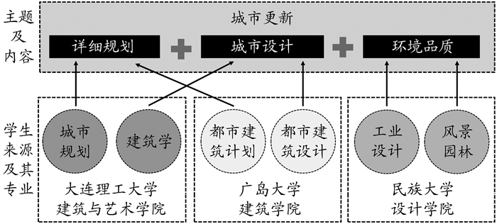 根据主题所涉及的专业方向,将设计内容分为详细规划、城市设计和环境品质三个部分,分别由城乡规划专业(城市建筑计划专业)、建筑学专业(城市建筑设计专业)、风景园林和工业设计专业的学生负责(见图 3)。中日不同学科专业背景的学生组成一组(4~6人/组,共分4~5组),通过“圆桌式”学习模式,各尽其职,相互学习,协作完成设计。中日教师全程参与方案指导与点评。