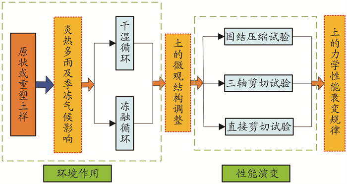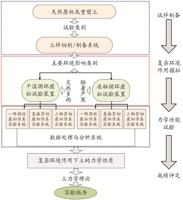 炎热多雨和酷暑严寒等剧烈环境作用会使土的力学性能极速衰减,工程设计及施工中如采用的参数不当,极易引发工程事故[3-4]。土工实验教学中,应引导学生认识环境气候对于土体力学性能的影响,结合区域环境气候条件对各类土的力学性能衰变规律进行试验研究[5-7]。而我国疆土面积广阔,土类分布复杂,且跨区域取样成本高昂,难以实现各类土样的采集与环境模拟实验[8-10]。此外,土样的环境作用模拟(干湿或冻融循环)周期长达数月甚至数年[11-12],学生难以在有限的实验课时内全面了解复杂环境作用对不同类别土体力学性质的影响规律。加之经历环境作用的土样极易扰动,力学性能测试时存在试样安装困难、试样酥化、实验结果离散性大等问题[13]。缺乏实操经验的操作者甚至会出现操作不当导致试验失败。