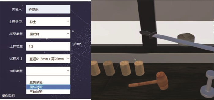 虚拟仿真实验系统可实现土样切削、制备及经历干湿/冻融循环过程的全过程模拟,学生可直观体验三轴、固结及直剪试验过程。虚拟实验与实体实验步骤基本相同,实验环境相似,操作感受逼真。学生在虚拟仿真实验系统中熟练掌握相关实验方法、操作步骤及数据处理与分析方法后,可返回实体实验室进行相关复杂环境下土的力学性质试验,通过虚实结合的方式了解环境作用对土体力学性状的影响,提高学习及科研效率。