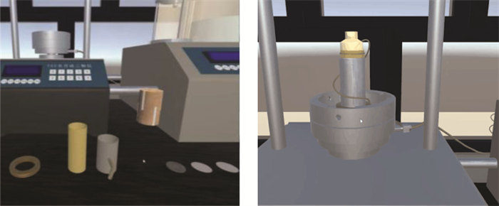 ① 将附带环刀试样安放于压缩容器护环内,并在容器内按顺序放上底板、湿润滤纸及透水石,随后放入加压的导环和传压板,如图 5所示。②将安装好试样的压缩容器放于加压台中央,将传压钢珠与加压横梁凹穴相连,随后安装测量百分表。③为保证压缩容器各部件接触良好,施加预压荷重1 kPa,各部件稳定后调整百分表读数至零处。④进行加压观测,在虚拟系统中选择相应荷载等级,荷重等级一般为25~1 600 kPa。根据系统提示选择试样饱和状态,系统根据试样饱和状态给出容器注满水或湿棉纱围住加压盖板四周两种动画反馈。⑤压缩稳定标准规定为每级荷重下压缩24小时,通过界面选择相应固结时间即可,然后点击鼠标施加第二级荷重,依次逐级加荷至试验结束。⑥试验结束后点击确定按钮,取出试样,对设备进行拆卸操作。