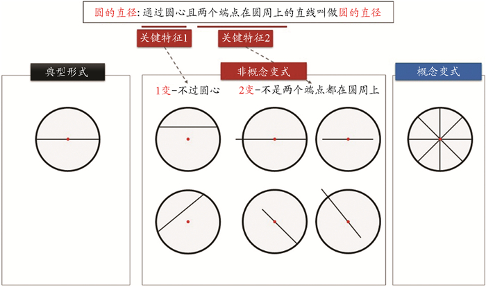 在中国,变式教学法较早运用于概念的教学。在20世纪80年代,学者结合数学教学实践对变式教学进行了系统、深入的实验研究与理论分析[7-9]。研究表明,概念性变式有助于学生准确把握思维技能方法。概念性变式是依托变异理论,通过对概念的多角度理解促进对概念的确切掌握,可分为概念变式和非概念变式[10]。“概念”是人类在认识事物的过程中,把所感知的事物的共同本质特点抽象出来并加以概括,形成概念式思维惯性。在概念描述中,必然会包含某一个或多个表示共同特点的部分,这些共同特点是判别本概念的重要依据,可称为“关键特征”。相应地,可将不属于“关键特征”的其他特点成为“非关键特征”。概念变式是指关键特征不变而非关键特征改变的变式,用来引入概念和突出概念的本质属性。非概念变式则是关键特征改变的变式,用来解释概念的对立面从而明确概念的外延[7]。图 1为数学中“圆的直径”的概念性变式示例。其中,基本概念中包含“通过圆心”和“两个端点在圆周上”这两个关键特征,对应的典型形式给出了最常见的直径图示。非概念变式是不满足其中一个关键特征的错误示例,包括不通过圆心和不是两个端点都在圆周上的情况。而概念变式为非关键特征的变化,即直线虽然不是水平直线、竖直或斜向,但在满足过圆心和两个端点都在圆周上的情况下仍是圆的直径。