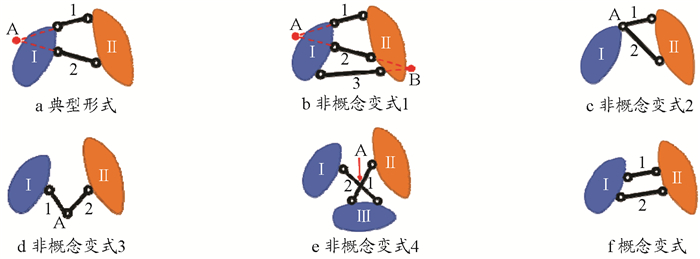 根据虚铰概念的3个关键特征,分别给出不满足某一个关键特征时的非概念变式,如图 2b—图 2e所示,并分别结合各关键特征的变化情况进行说明。非概念变式1不满足“两根链杆连接”刚片的情况,如图 2b所示,刚片Ⅰ和Ⅱ由3根链杆连接,则连接Ⅰ和Ⅱ的是虚铰A和链杆3,或虚铰B和链杆1,不能认为是两个虚铰或仅有一个虚铰。非概念变式2不满足“两根链杆不相连”的情况,如图 2c所示。链杆1、2连接在一起(交于点A),则连接刚片Ⅰ和Ⅱ的是实铰A,不是虚铰。非概念变式3和非概念变式4不满足“两刚片之间的连接”的情况,如图 2d、2e所示。其中,图 2d中链杆1和2不是刚片Ⅰ和Ⅱ之间的(直接)连接,则A不是虚铰;图 2e中链杆1连接刚片Ⅰ、Ⅱ,链杆2连接刚片Ⅰ、Ⅲ,不是两个相同刚片之间的连接,两根链杆不是两个刚片之间的连接,则A不是虚铰。
