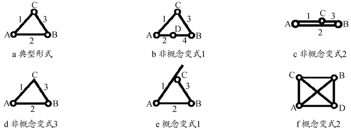 (二) 铰结三角形的概念性变式铰结三角形概念:三根链杆由不共线的三个铰两两连接,组成的体系为铰结三角形。这个概念包括必须满足的3个关键特征,即“三根链杆”“不共线”“三个铰两两连接”。根据概念,铰结三角形的典型形式、非概念变式和概念变式如图 3所示。