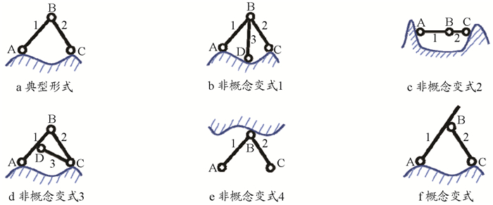 根据虚铰概念的3个关键特征,分别给出不满足某一个关键特征时的非概念变式,如图 3b-3d所示,并分别结合各关键特征的变化情况进行说明。非概念变式1不满足“三根链杆”的情况,如图 3b所示,4根杆由4个铰连接,即使AD、BD共线,看似形成三角形图形,但三角形ABC不是铰结三角形。非概念变式2不满足“不共线”的情况,如图 3c所示,铰A、B、C在一条直线上,三角形面积蜕化为零,这时图形ABC不是铰结三角形。非概念变式3不满足“三个铰两两连接”的情况,如图 3d所示,杆件1、3之间是由刚结点C连接的,则三角形ABC不是铰结三角形。