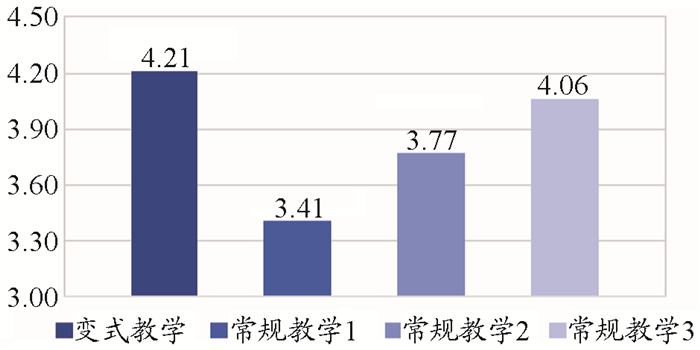 (四) 变式教学效果分析体系几何组成的上述概念对应的典型形式一般是教材中普遍在介绍概念后给出的典型示意图,也是学生最直接记忆或理解的概念典型形式,如果体系分析中出现这种典型图示,学生一般都能正确判断。由于体系的形状和杆件组成方式多种多样,学生在具体题目中遇到的往往不是概念介绍时的典型形式,如果没有理解概念的内涵和外延,经常会出现概念性错误,影响体系几何组成分析规则的应用,进而导致结果错误。以往教学经常在学生作业或测试题中出现错误后,在作业讲解或习题课上进行教学反馈,从认知规律看,不利于知识的掌握。为使学生在学习概念初期就能形成完整深入的理解,可在总结常见错题的基础上,采用变式教学法教授概念,详细介绍满足概念要求的其他形式、给出非概念变式和概念变式的图示,以增强学生对新概念的理解。将概念性变式引入几何组成分析一章的教学后,学生作业和考试的错误有所减少。为分析教学效果,作者在学期末的教学内容掌握情况调查中对学生掌握体系几何组成分析一章的情况进行了调研,要求学生对本章知识点的掌握程度进行主观评分,总分为5分。不同学年、不同方法的土木工程专业本科学生学习效果评价如图 5所示。其中,变式教学法为2020年线上、线下混合教学中初次采用变式教学法的学习效果评分。常规教学1、2、3分别为2020年线上、线下混合教学中2019年和2018年在线下教学中采用常规教学法的学生学习效果评分。